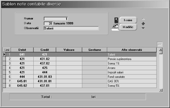 }inând cont de acest lucru, programul prezint\ posibilitatea `nregistr\rii unor [abloane a notelor contabile care pot fi preluate lun\ de lun\ [i modifica `n sensul preciz\rii valorii opera]iilor [i ad\ug\rii sau [tergerii unor opera]ii.