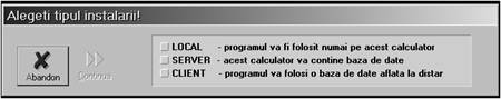 Optiunile "SERVER" si "CLIENT" permit instalarea programului īntr-o retea de calculatoare, cu acces concurent asupra bazei de date. In primul caz, selectia se refera la instalarea programului pe server, iar īn al doilea caz la instalarea pe un post de lucru din cadrul retelei.