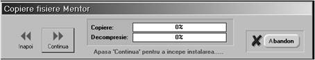 Relansarea programului de instalare afiseaza fereastra prezentata īn Fig.4., prin care la selectarea butonului "CONTINUA" se lanseaza instalarea propriu-zisa a programului īn conditiile pe care chiar Dumneavoastra le-ati descris anterior. In aceasta etapa are loc copierea si dezarhivarea fisierelor de pe CD-ul de instalare.