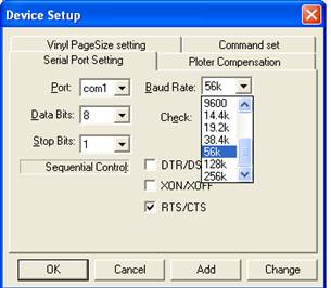 - apasati butonul SETUP si selectati la port COM1 , la Sequential Control sa fie bifate RTS/CTS,iar la Baud Rate sa fie 56k(56000) ca in figura de mai jos: