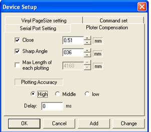 apasati butonul Ploter Compensation si faceti setarile ca in imaginea de mai jos (aceste setari se pot modifica in functie unghiul cutitului utilizat)