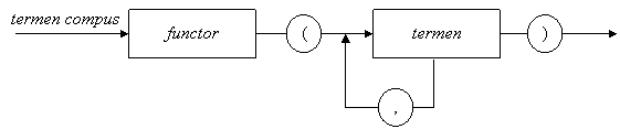 unde functor este un atom (de oricare din cele trei tipuri descrise mai sus), iar argumentele t1, t2, , …, tn sunt termeni, care pot fi simpli sau structurati la randul lor. Functorul defineste practic modul de structurare al termenului respectiv. Avand in vedere faptul ca numarul de argumente al functorului este variabil, iar gradul de imbricare este teoretic nelimitat, un termen compus poate reprezenta practic orice structura relationala de date, indiferent de gradul de complexitate al acesteia. In sintaxa imbricata a unui termen compus, functorul cel mai exterior este denumit functor principal.