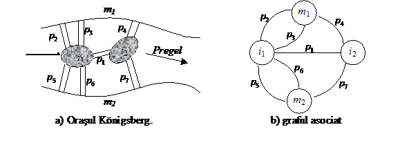 Grafurile constituie un instrument practic si eficient de reprezentare a obiectelor si a relatiilor dintre acestea. Teoria grafurilor a fost introdusa la inceputul secolului al XVIII-lea de matematicianul austriac Leonhard Euler in vederea solutionarii celebrei probleme cunoscuta sub numele de “podurile din Königsberg”. Königsberg este un orasel austriac asezat pe ambele maluri ale raului Pregel, rau care formeaza doua insule. Malurile si cele doua insule sunt conectate prin sistemul de poduri ilustrat in figura 1a. Problema, care a framantat multe persoane pana la Euler, este urmatoarea: poate un calator sa parcurga intregul orasel, trecand pe fiecare pod, fara sa parcurga un pod de doua ori ?
