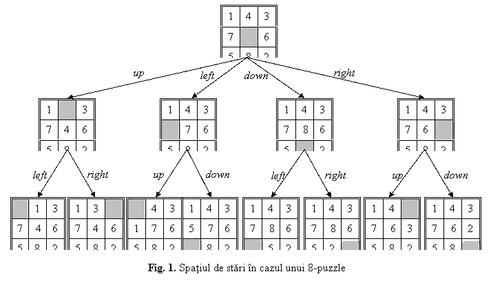 Exemplul 1. Este foarte cunoscut asa numitul joc 15-Puzzle constituit din 15 jetoane patrate numerotate de la 1 la 15 dispuse intr-un chenar, jucat de majoritatea copiilor. Fie, pentru simplitatea reprezentarii, un joc 8-puzzle: