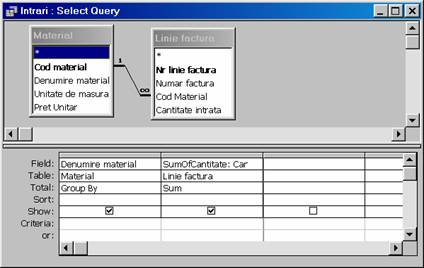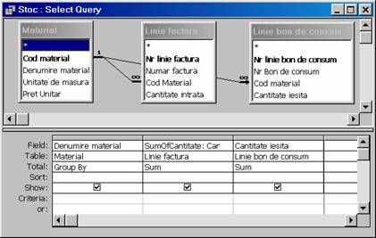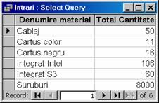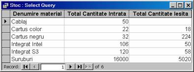 De exemplu dorim sa cream o cerere de interogare care sa ne prezinte totalul materialelor intrate (cantitativ) precum si totalul materialelor iesite.