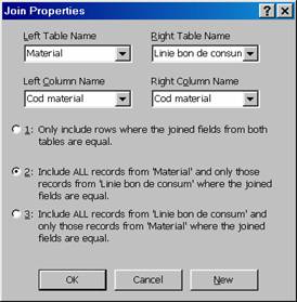 În timp, poate fi achizitionat un material nou, care nu a intrat înca în consum. Astfel, în cadrul tabelei Linie bon de consum, nu exista nici o înregistrare privind acel material. Prin urmare relatia join pe care o vom defini între tabelele Material si Linie bon de consum va fi de tipul compunere externa stânga.