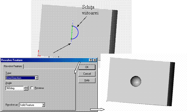 unesc cu o linie. Pentru a realiza scobirea, se foloseste comanda REVOLVED CUT din meniul INSERT, CUT, REVOLVE sau se apasa