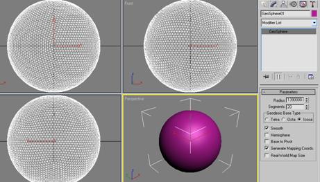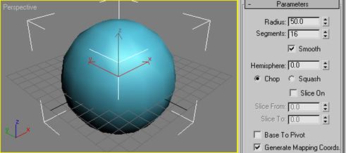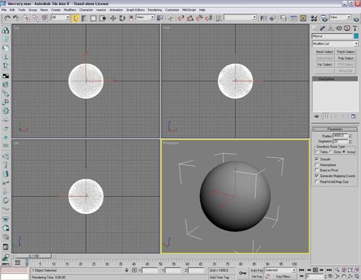 Pentru inceput se va crea ([Create]->[Geometry]->[Sphere]) o sfera de raza(Radius) egala cu 50 si numar de segmente (Segments) egal cu 16 si se bifeaza optiunea Generate Mapping Coords, ca in figura de mai jos.