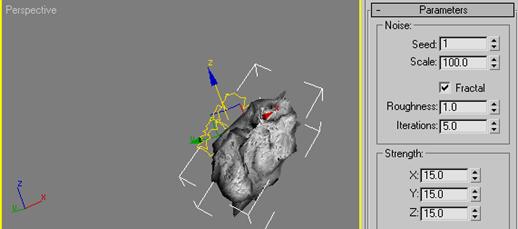 Se aplica modificatorul Noise([Modify]->[Modifier List]->[Noise]), cu urmatoarele valori : Seed=1, Scale=100, Fractal bifat, Rougness=1, Iterations=5, Strenght X,Y si Z=15