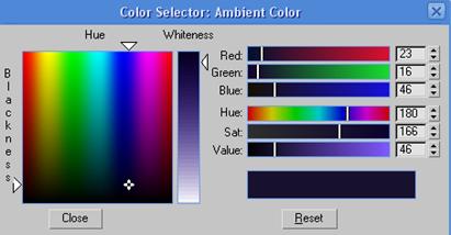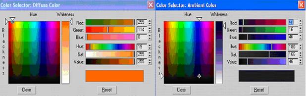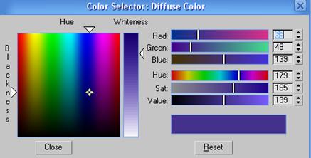 Deschidem editorul de culori apasand tasta M si intr-un slot nefolosit, apelam pentru inceput la Difusse.In caseta care apare, modificam numerele specifice culorilor, dupa cum se vede in imaginea de mai jos.