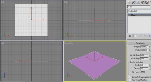 Se creaza in primul rand un plan, folosind obiectul Plane din Standard Primitives. Planul va avea lungimea si latimea de 10 000, iar numarul de segmente va fi setat la 100 atat pentru lungime cat si pentru latime. Cu cat numarul de segmente este mai mare, cu atat deformarile ulterioare se vor vedea mai bine si mai realistic.