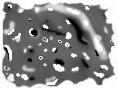 Pentru a crea relieful in sine, este necesar ajutorul oferit de un program de desenat. In acest caz, s-a folosit Paint pentru a crea formele de relief in brut, iar Ulead Photo Shop pentru a grada trecerea de la o culoare la alta. A fost nevoie de crearea unei imagini formata din culorile negru, alb, si nuante de gri. Desenul s-a bazat pe principiul urmator: cu cat culoarea este mai inchisa, cu atat planul se va deforma in jos, iar cu cat nuanta se apropie de alb, acea parte a planului care ii corespunde se va inalta. Initial desenului i sa acordat o nuanta de gri peste care s-au desenat formele de relief corespunzatoare si aceasta este imaginea obtinuta: