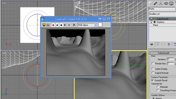 La fel ca si in cazul anterior, relieful ia nastere cu ajutorul modifier-ului Displace. La sectiunea Image a parametrilor acestuia, se apasa pe butonul de sub optiunea Bitmap, pe care initial apare textul None. In fereastra aparuta se navigheaza pana in directorul in care se gaseste imaginea "Desert.jpg" si se apasa OK. Se aplica modifier-ul Turbo Smooth, iar parametrul Iterations se seteaza la valoarea "2" pentru a elimina inesteticile segmente vizibile din cauza deformarilor planului.