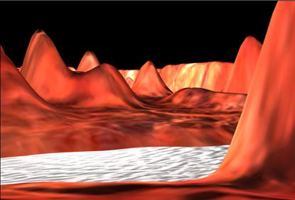 Intr-adevar acum imaginea are un aspect realistic. Urmatoarea etapa urmareste crearea unor ghetari sub forma unor lacuri. Pentru aceasta se va crea inca un plan, cu lungimea de 725 si latimea de 722. Se aseaza planul pe locul sau in planul suprafetei Marte, astfel incat sa "umple" golul destinat pentru el. Se observa un colt care ajunge la o alta adancitura din plan si care nu trebuie sa se vada. Acesta va trebui decupat. Pentru a face asa ceva se folosteste un obiect de tip Boolean. Acesta poate fi gasit in sectiunea Compound Object. Se creaza intai un Box care se pozitioneaza astefl incat sa "inghita" coltul ce trebuie taiat. Se selecteaza planul lacului. Se creaza obiectul Boolean, si se apasa pe butonul Pick Operand B, apoi se selecteaza box-ul recent creat. Se observa faptul ca a disparut coltul "nedorit" impreuna cu Box-ul.