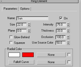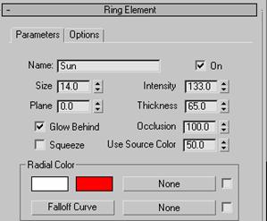 Ca mai sus va arata soarele nostru, dar nu e nici aceasta forma sa finala, pentru ca inelele sale nu par a apartine obiectului creat, de aceea tot in cadrul instructiunii Ring, modificam Intensity: 133, Size: 14, Thickness: 65 si bifam Glow Behind.