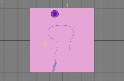 Se roteste camera daca este nevoie pana cand este asezata de-a lungul caii. In Viewport-ul Perspective se apasa tasta "c" pentru a vedea prin obiectivul camerei. Selectand calea creata, in sectiunea Modify se apasa pe "+"-ul din stanga obiectului NURBS si se selecteaza optiunea Point. Acum punctele caii au devenit vizibile si pot fi mutate mai sus sau mai jos, dupa nevoie. Rezultatul final este: