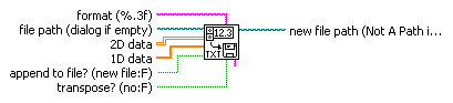 - Functia Write To Spreadsheet File.vi realizeaza conversia unui vector sau a unei matrici de numere cu simpla precizie într-un sir de caractere si scrie acest sir într-un fisier specificat sau îl adauga la sfârsitul fisierului daca acesta deja exista.