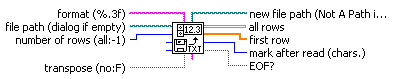 - Functia Read From Spreadsheet File.vi citeste un numar specificat de linii sau rânduri dintr-un fisier ce contine numere începând cu un caracter specificat si realizeaza conversia datelor într-o matrice de numere cu simpla precizie.