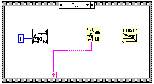 la care se conecteaza constanta 1. Se alege astfel operatia de creare a unui nou fisier. De asemenea, se va mai introduce functia Write File pentru scrierea textului în fisier si functia Close File pentru a închide fisierul.