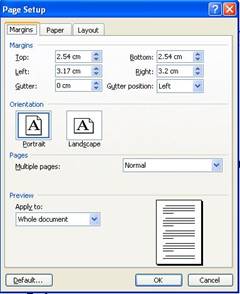 Pentru a modifica marginile documentului in procesul de pregatire pentru tiparire, precum si orientarea acestuia, se alege comanda Page Setup din meniul File, eticheta Margins.