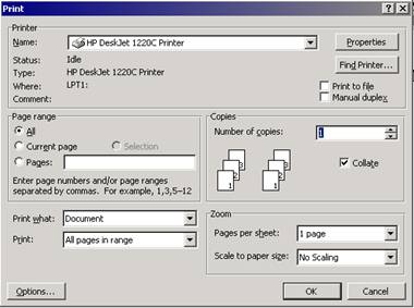Trebuie precizat ca prin actionarea butonului Options plasat in dreapta-jos a casetei de dialog Print veti putea sa selectati sau sa deselectati cateva optiuni suplimentare de tiparire a documentului prin actionarea clic-stanga a mouse-ului in casetele de validare care compun urmatoarea caseta de dialog Print care urmeaza sa apara pe ecranul monitorului.