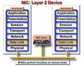 NIC-urile sunt considerate dispozitive de nivel 2 , pentru ca fiecare NIC detine un unic nume , numit adresa Media Access Control (MAC) . Dupa cum sugereaza si numele , interfata adaptoare de retea (NIC) controleaza accesul gazdei la mediul de transmisie . Uneori placa NIC are dispozitiv de transmitere separat (transmitotor/receptor) oricum ,placile NIC moderne au emitator incorporat(care converteste semnalul electric intr-un alt semnal electric sau intr-unul optic ) . Daca un emitator e folosit de el insusi(e.g. pentru a converti semnalele electrice in semnale optice ),este considerat dispozitiv de nivel 1 ,pentru ca nu face decat sa citeasca bitii si nu implica nici informatie legata de adres 252d38c a sau protocoale de nivel superior . |