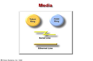 Exista diferite tipuri de fire (e.g. bifilar torsadat [protejat sau neprotejat] , coaxial, fibra optica) care pot fi folosite in diferitele segmente ale retelei , de aceea modul de aparitie , in diagrama , poate varia foarte mult . Segmentele din diagrama expusa pot fi considerate techonologii de nivel 1 si 2 .In timp ce fiecare segment executa operatii ce implica toate nivelele , diferenta dintre Ethernet, token-ring, si FDDI ,consta in specificatiile de nivel 1 si 2 . |