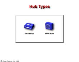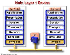 Hub-urile sunt considerate dispozitive de nivel 1 pentru ca trateaza doar informatia pe biti si nu necesita nici o alta informatie de la nici un alt nivel al modelului OSI . Rolul hub-ului intr-o retea token-ring e preluat de a Media Access Unit (MAU). Din punct de vedere fizic ,inlocuieste un hub , dar din cauza technologiei token-ring care este foarte diferita , in FDDI, MAU ieste numit concentrator. MAU-urile sunt dispozitive de nivel 1 . |
