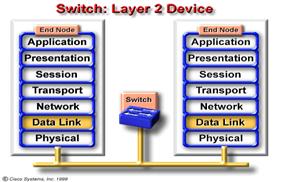Switch - ul e considerat a fi un hub cu porturi individuale care se comporta precum bridge-urile individuale . Switch - ul preia pachetele , le decapsuleaza pentru nivelul 2 , examineaza adresele MAC si trimite mai departe pachetele (le comuta) catre cel mai apropiat port .Pentru ca circuitele switch-ului iau aceste decizii dupa ce analizeaza adresele MAC ,si switch -urile sunt considerate dispozitive de nivel 2. |