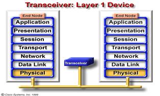 Daca dispozitivele de nivel 1 sunt pasive(e.g. conectori , medii de transmisie), atunci bitii nu fac decat sa calatoreasca prin aceste dispozitive , sperand ca erorile vor fi cat mai mici. Daca dispozitive de nivel 1 sunt active (e.g. amplificatoarele sau hub-urile), atunci bitii sunt practic amplificati si retransmisi. Transmitatoarele , de asemenea , sunt considerate dispozitive active ;se comporta precum adaptoarele (AUI port al RJ-45), convertoarele de mediu (RJ-45 electric in ST Optic), sau precum parti ale unui adaptor de retea( NIC ). In oricare di cazuri , transmitatoarele se comporta precum dispozitivele de nivel 1.