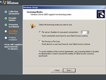 modul de licentiere care in cazul Windowsului 2003 Server permite doua variante: