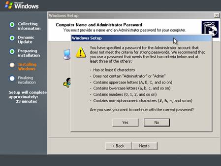 3. Ca setarea parolei de superutilizator in mod implicit se cere setarea unei parole complexe. Daca se introduce o parola simpla apare o fereastra de avertisment unde sunteti intrebat daca doriti sa continuati cu parola respectiva. In cazul in care se alege varianta Nu, apare din nou ecranul de introducere a parolei unde puteti alege o parola complexa.