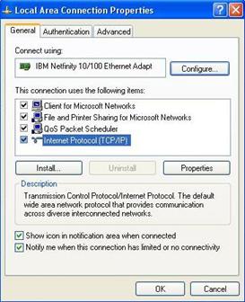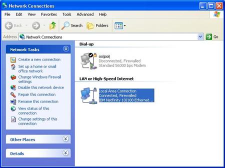 In imaginea de mai sus numele placii de retea este IBM Netfinity , aceasta trebuie tot timpul sa fie Connected, adica activata (daca aceasta este Disabled, se va activa cu right-click pe Local Area Connection -> Enable) .