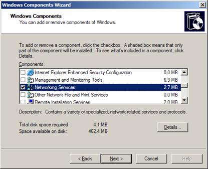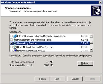 In caseta de dialog "Windows Components Wizard", selectati "Networking Services" si dati clic pe butonul Details ca in figura de mai jos.