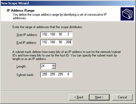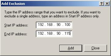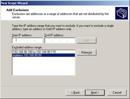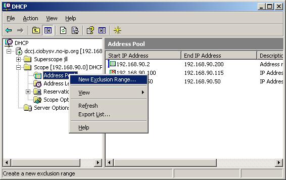 Grupul de adrese afiseaza o lista de domenii de IP-uri asignate pentru distributie si excluziuni de adrese IP. Puteti adauga o excluziune de adrese prin dand un clic dreapta pe Address Pool din partea stanga a ferestrei MMC si selectand optiunea "New Exclusion Range". Aceasta va afisa o caseta de dialog ce va permite sa adaugati domeniul de adrese ce va fi exclus. Introduceti doar adresele IP de inceput si de sfarsit. Daca introduceti numai adresa IP de inceput veti adauga o singura adresa IP.