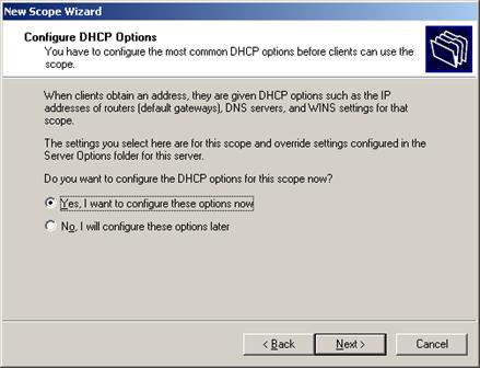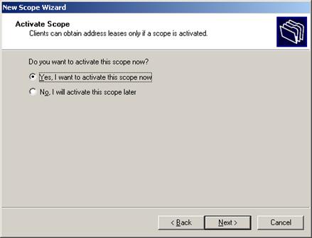 Ultimul pas este de a activa scopul - doar apasati pe butonul Next cand vedeti fereastra de mai jos. Serverul de DHCP nu va functiona daca nu activati scopul.