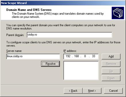 Aici setati, serverul DNS si numele domeniului. Adresa IP a serverului DNS va fi distribuita de catre serverul DHCP si va fi atribuita clientilor.