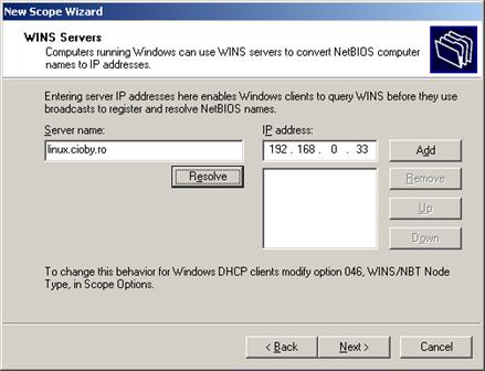 Daca aveti un server de WINS, aici trebuie sa setati adresa IP a acelui server. Puteti sa tastati numele serverului in caseta potrivita si apasati "Resolve" pentru a permite gasirea respectivei adrese IP. daca nu aveti un server de WINS in retea lasati aceasta pagina necompletata.
