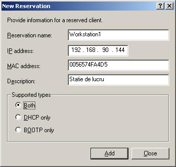 Server-ele DHCP va permit sa rezervati o adresa IP pentru un client. Aceasta inseamna ca acel client va avea aceeasi adresa IP atat cat doriti. Pentru a realiza acest lucru trebuie sa cunoasteti adresa fizica (MAC) a fiecarei placi de retea. Dati clic dreapta pe "Reservations" si alegeti optiunea "New Reservation". Introduceti numele rezervarii, adresa IP dorita, adresa MAC si descrierea, apoi alegeti daca doriti suport pentru DHCP, BOOTP sau ambele si dati clic pe Add. Noua rezervare va fi adaugata in lista. Ca exemplu am rezervat adresa IP 192.168.90.144 pentru un calculator client numit Workstation1.