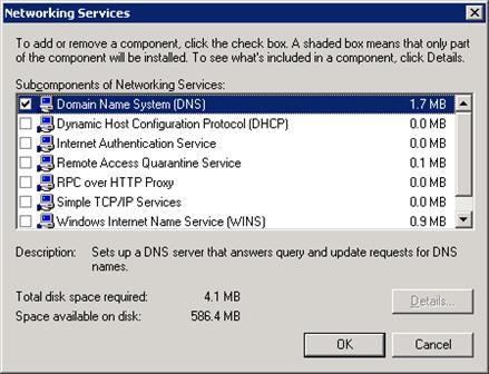 Selectati "Domain Name System (DNS)" ca in figura urmatoare si dati clic pe OK pentru a inchide fereastra si apoi clic pe Next pentru a instala serviciul DNS. Vi se va cere sa introduceti CD-ul cu kitul de Windows Server 2003. Dati clic pe Finish pentru a incheia instalarea.