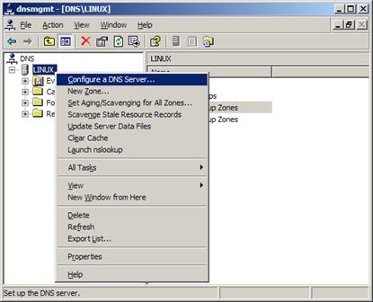 Pentru a incepe configurarea serverului DNS dati un clic dreapta pe numele serverului si alegeti optiunea Configure a DNS Server..., si va apare wizard-ul de configurare pentru serverul DNS.