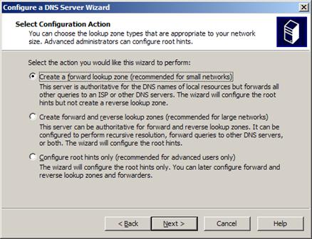 In urmatoarea caseta de dialog selectati "Create a forward lookup zone" si dati clic pe Next. Aceasta zona trebuie sa fie o zona primara astfel incat sa accepte actualizari dinamice de DNS. Tot aici mai aveti optiunea de a crea un "reverse lookup zone" folosita in general in retele de dimensiuni mari si optiunea de a configura "root hints" care este fisierul ce contine adresele serverelor DNS radacina.