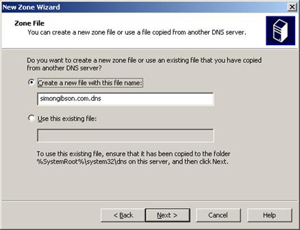 In urmatoarea fereastra se creeaza fisierul cu numelei zonei DNS prin adaugarea extensiei .dns la numele domeniului sau puteti seta calea catre un fisier existent ce contine informatii despre serverul DNS. Informatiile DNS sunt stocate in directorul system32 din Windows. Lasati numele implicit ales de sistemul de operare si dati clic pe Next.