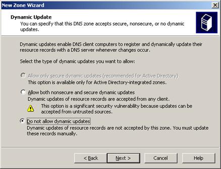 Apoi veti avea posibilitatea de a alege tipul de actualizare pentru zonele DNS. Prima optiune "Allow only secure updates" este valabila numai in cazul zonelor integrate in Active Directory. Daca nu este configurat Active Directory optiunea este dezactivata. A doua optiune "Allow both nonsecure and secure dynamic updates" permite actualizari de la orice client. Aceasta prezinta vulnerabilitati deoarece actualizarile pot fi acceptate de la surse care nu sunt de incredere. Ultima optiune "Do not allow dynamic updates" permite actualizarea manuala a inregistrarilor. Este preferata cand nu se foloseste Active Directory.