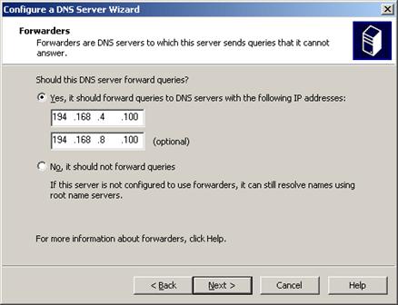 In urmatoarea caseta de dialog putem inainta interogarile catre alte servere DNS specificate prin adrese IP. Daca nu se doreste utilizarea de "forwarders", serverul va rezolva numele utilizand serverele DNS radacina. De exemplu in cazul domeniului cioby.ro toate cererile vor fi rezolvate de serverul DNS local, iar toate celelalte vor fi inaintate de catre serverele DNS externe.