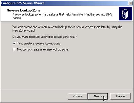 Dati clic pe butonul Next si Finish pentru a incheia crearea zonei DNS. Puteti crea si o zona "reverse lookup zone" ce realizeaza translatarea adreselor IP in nume DNS. La selectarea optiunii New Zone... puteti alege crearea unei zone de "reverse lookup" ca in figura de mai jos.