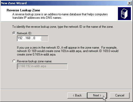 In urmatoarea pagina tastati ID retelei pentru numele zonei. Daca aveti deja un fisier configurat puteti selecta optiunea "Reverse lookup zone name" si treceti numele fisierul ce contine zona de forma x.x.x.in-addr.arpa (de exemplu pentru o adresa de clasa C va fi: 0.168.192.in-addr.arpa). Dati clic pe butonul Next.