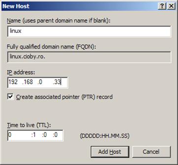 Acum ca serverul DNS este operational, va trebui sa adaugam un hostname. Pentru realizarea acestui lucru dati un clic dreapta pe spatiul alb din consola de management DNS si selectati din meniu optiunea "New Host (A)". in caseta de dialog New Host treceti la Name numele pe care il doriti pentru host. Dedesubt se completeaza automat numele complet in DNS (in cazul nostru linux.cioby.ro). Introduceti adresa IP in campul "IP address". Daca se bifeaza optiunea "Create associated pointer (PTR) record" va fi creata o inregistrare in "reverse lookup zone" pentru host-ul linux. Campul "Time to live (TTL)" specifica durata de viata a unei inregistrari in cache-ul serverului DNS, in cazul nostru aceasta fiind de 1 ora. Dupa ce ati realizat toate setarile dati clic pe butonul Add Host.