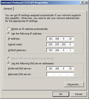 Pentru a configura sistemele client sa utilizeze noul server DNS trebuie sa faceti cateva schimbari in setarile lor de retea. Pentru aceasta dati clic dreapta pe iconita "My Network Places" de pe Desktop si alegeti Properties. Apoi dati clic dreapta pe "Local Area Connection" si selectati Properties. Aici selectati din lista "Internet Protocol (TCP/IP)" si dati clic pe Properties. Va fi afisata caseta de dialog de mai jos.