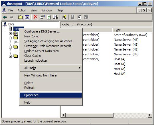 In consola de management DNS, dati clic dreapta pe numele serverului DNS si alegeti din meniu Properties.